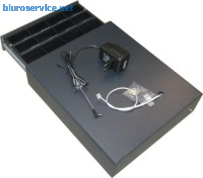 Wymiary: 350/104/405 [mm]. Cztery przegrody z dociskami na banknoty, 8 przedziałów na bilon. Przegrody i przedziały wyjmowane i o regulowanej pojemności. Dwa klucze do zamknięcia szuflady. Przycisk awaryjnego otwierania pod szufladą. Szuflada "aktywna" podłączana do złącza RS232 (RJ4) kasy/drukarki i sterowana sygnałem "logicznym" , zasilana własnym zasilaczem 9V (w komplecie z szufladą). Napięcie elektromagnesu szuflady ok. 8-12 [V]. Kolor grafit. Uwaga! Przy podłączonej szufladzie aktywnej współpraca kasy/drukarki z komputerem odbywa się przez port USB!